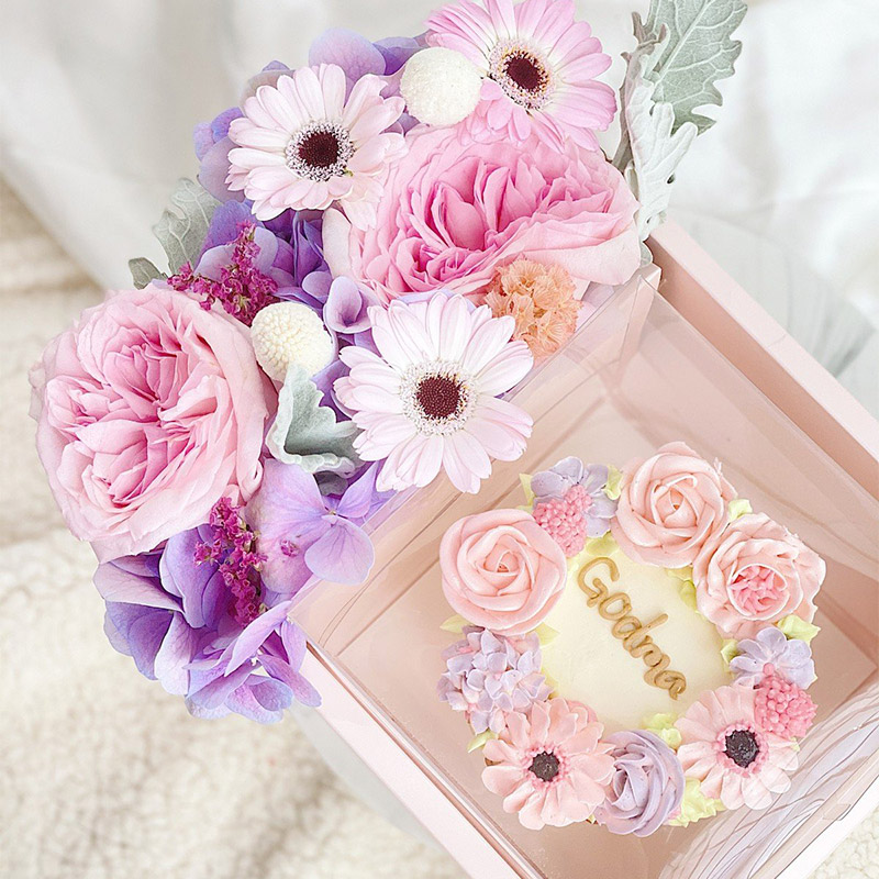 Each box comes meticulously packed in a transparent box with built in carrier, comprises of a petite arrangement of flowers & a 3” buttercream floral cake.