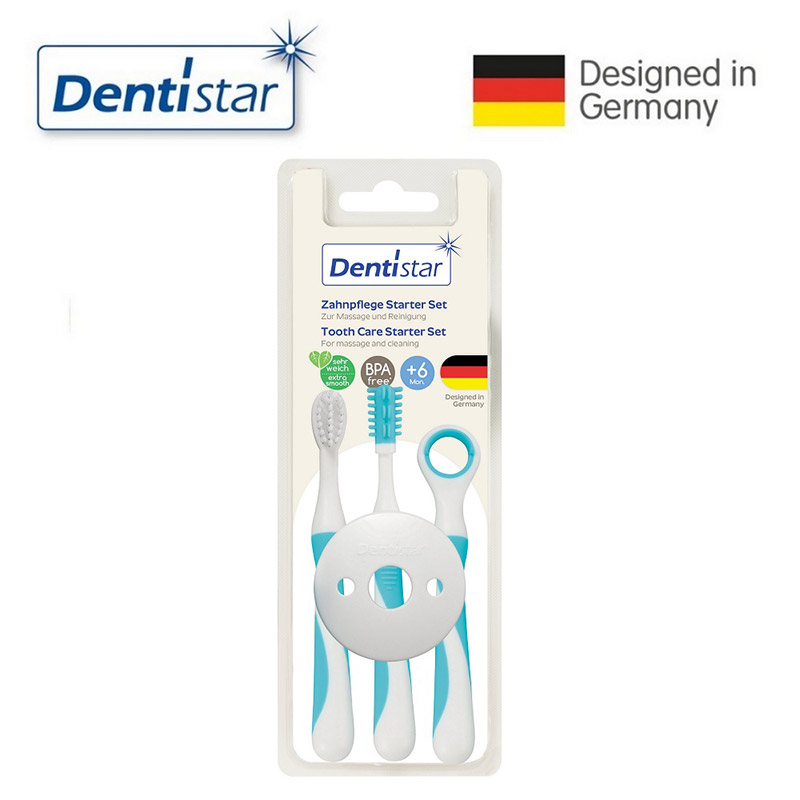 Dentistar Tooth Care Starter Set includes a toothbrush, a tongue cleaner, as well as, a brushing trainer with protection ring.